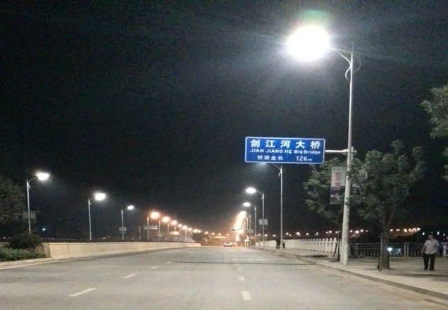 重慶綠色科技開發(集團)有限公司在貴州省黔南州都勻市劍江河大橋采取合同能源管理方式實施了120W “十惠牌”LED智能路燈替換275W 鈉燈節能改造項目,主要具有路面燈光清晰度高(顯指70)、均勻度好、光效高等特點,該燈具性能指標均領先全國同類產品,采用我司自主研發的專利技術“互聯網+多色溫LED路燈、隧道燈六遙(多色溫、遙調、遙測、遙控、遙視、遙信)控制系統”(專利號:2015204938054)遙控可實現智能控制。本產品是我司利用多項自主專利技術(專利號:201320842388、201320028126、2015204938054)研發、制造的LED智能路燈產品,并已獲得“重慶市高新技術產品”、“重慶市市政行業新技術認證”。案例實景照片展示如下(2014年11月27日):