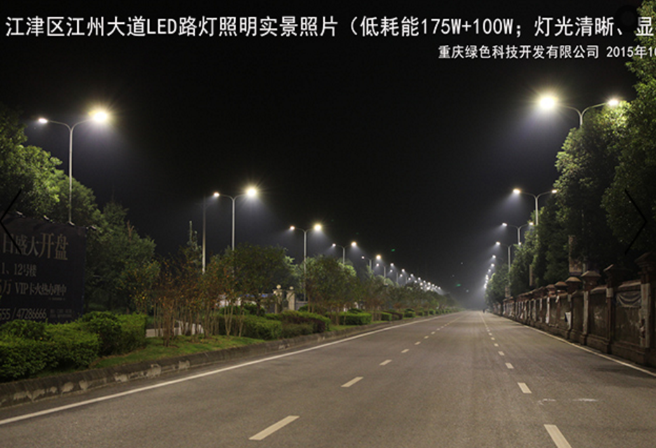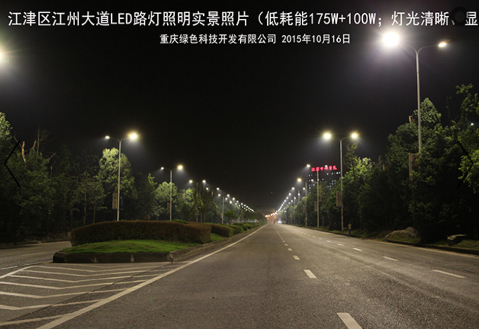 重慶城建經(jīng)濟(jì)(集團(tuán))重慶綠色科技開發(fā)(集團(tuán))有限公司對(duì)江津區(qū)江州大道實(shí)施的175W+100W“十惠牌”LED智能路燈替換440W+275W鈉燈節(jié)能改造項(xiàng)目,主要具有路面燈光清晰度高(顯指70)、均勻度好、光效高等特點(diǎn),該燈具性能指標(biāo)均領(lǐng)先全國(guó)同類產(chǎn)品,若配用我司自主研發(fā)的專利技術(shù)“互聯(lián)網(wǎng)+多色溫LED路燈、隧道燈六遙(多色溫、遙調(diào)、遙測(cè)、遙控、遙視、遙信)控制系統(tǒng)”(專利號(hào):2015204938054)可實(shí)現(xiàn)智能控制。本產(chǎn)品是我司利用多項(xiàng)自主專利技術(shù)(專利號(hào):201320842388、201320028126、2015204938054)研發(fā)、制造的LED智能路燈產(chǎn)品,并已獲得“重慶市高新技術(shù)產(chǎn)品”、“重慶市市政行業(yè)新技術(shù)認(rèn)證”。案例實(shí)景照片展示如下(2015年10月16日):