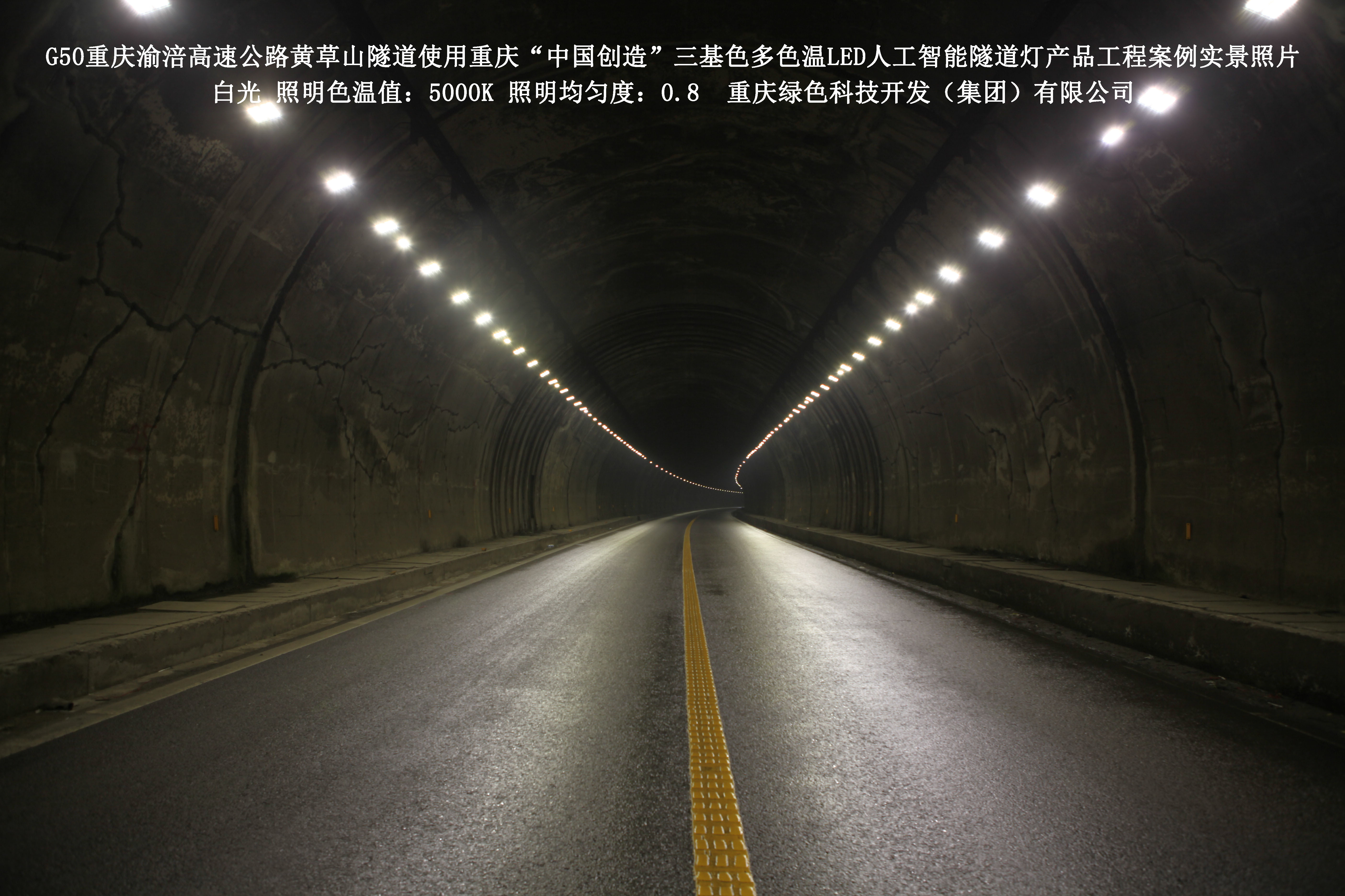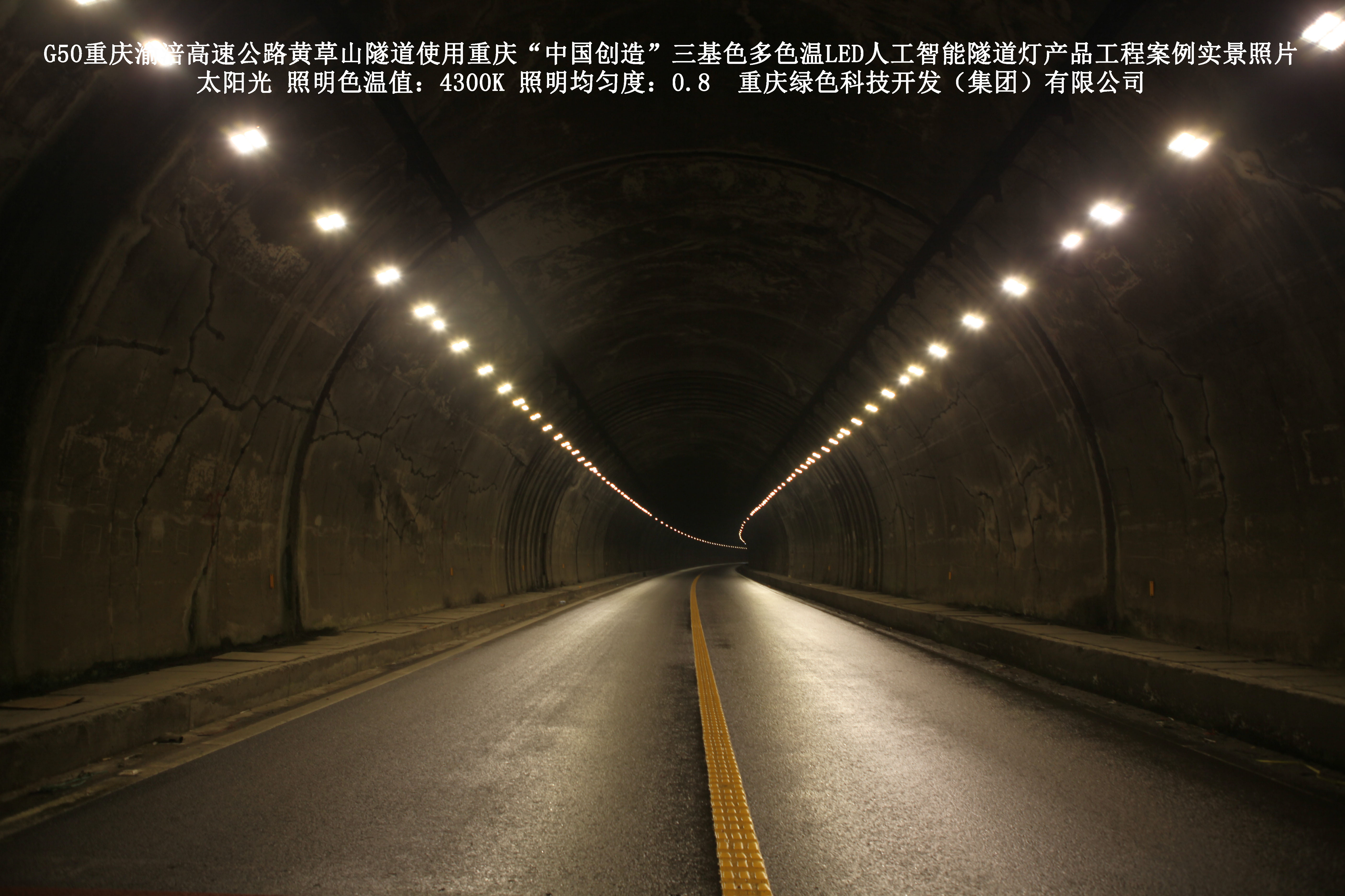 2016年7月,重慶渝涪高速公路有限公司使用了我司研發制造的重慶“中國創造”三基色多色溫LED人工智能隧道燈,對G50重慶渝涪高速公路黃草山隧道實施了綠色照明科技節能改造工程,工程實施后,極大地提高了隧道內照明清晰度、燈光均勻度、舒適度。通過智能終端實現單燈感知、線纜防盜報警,與原高壓鈉燈相比,節能率60%以上,有效解決了關閉控制回路或間隔關燈方式造成的照明暗區,確保車輛通行的安全。