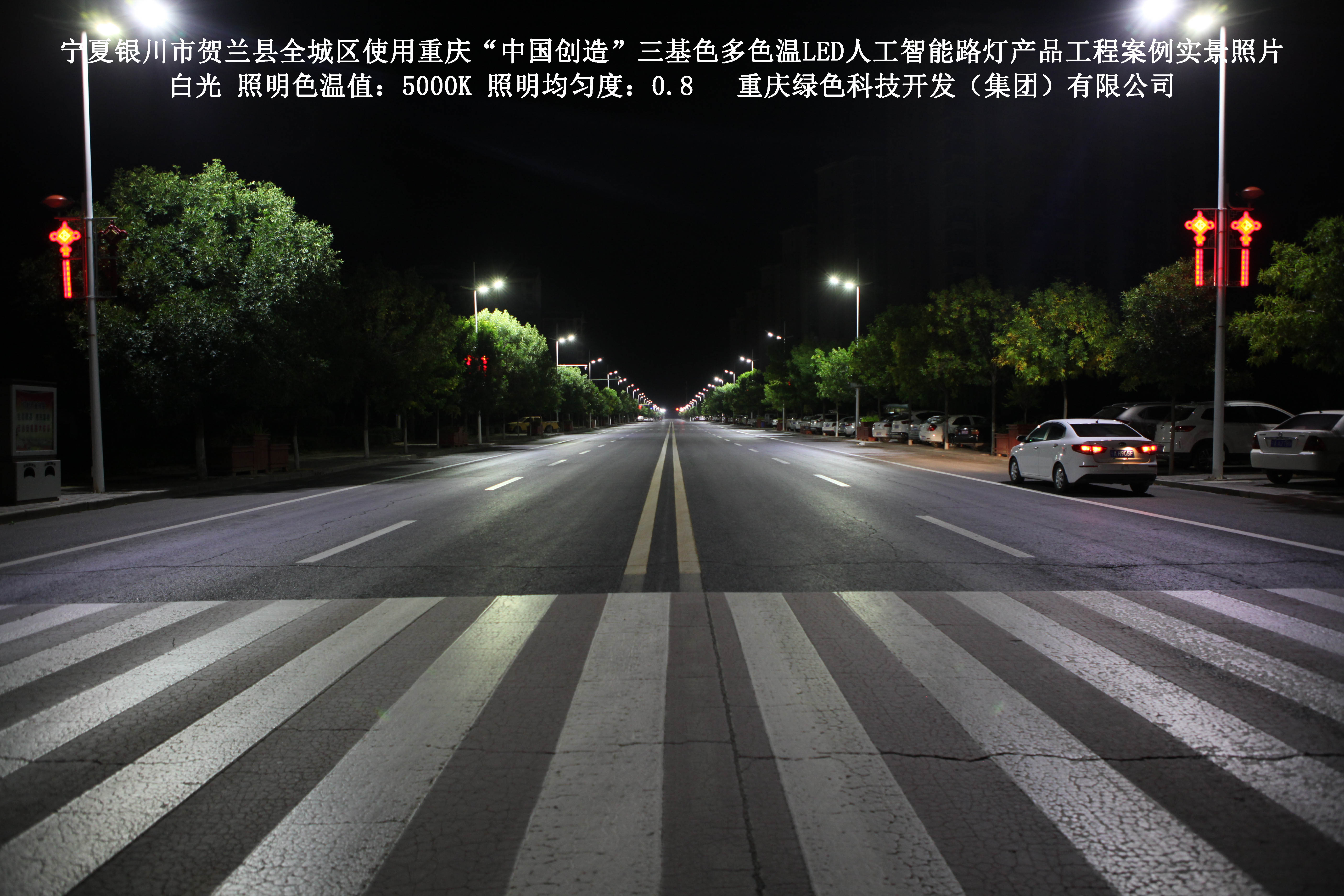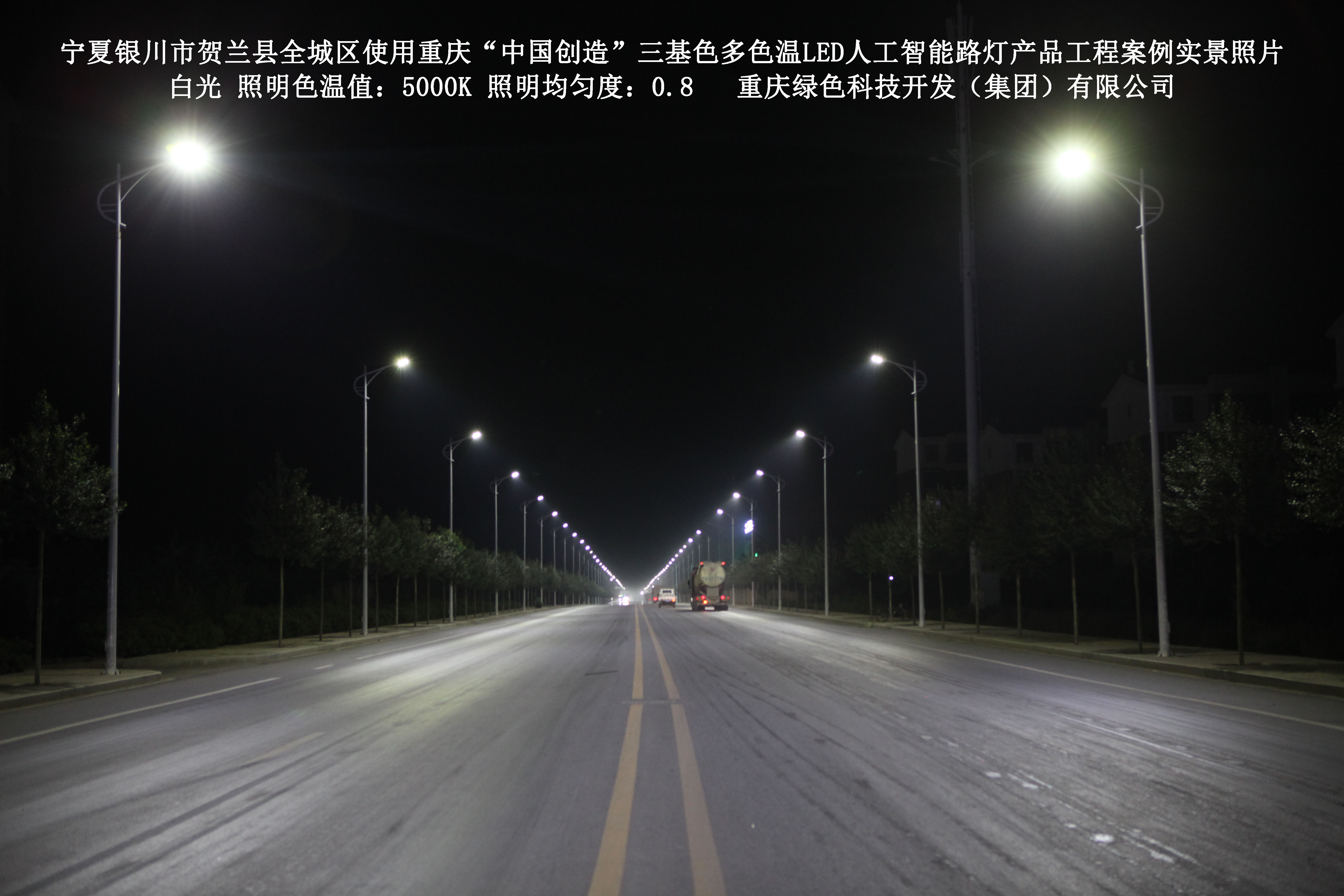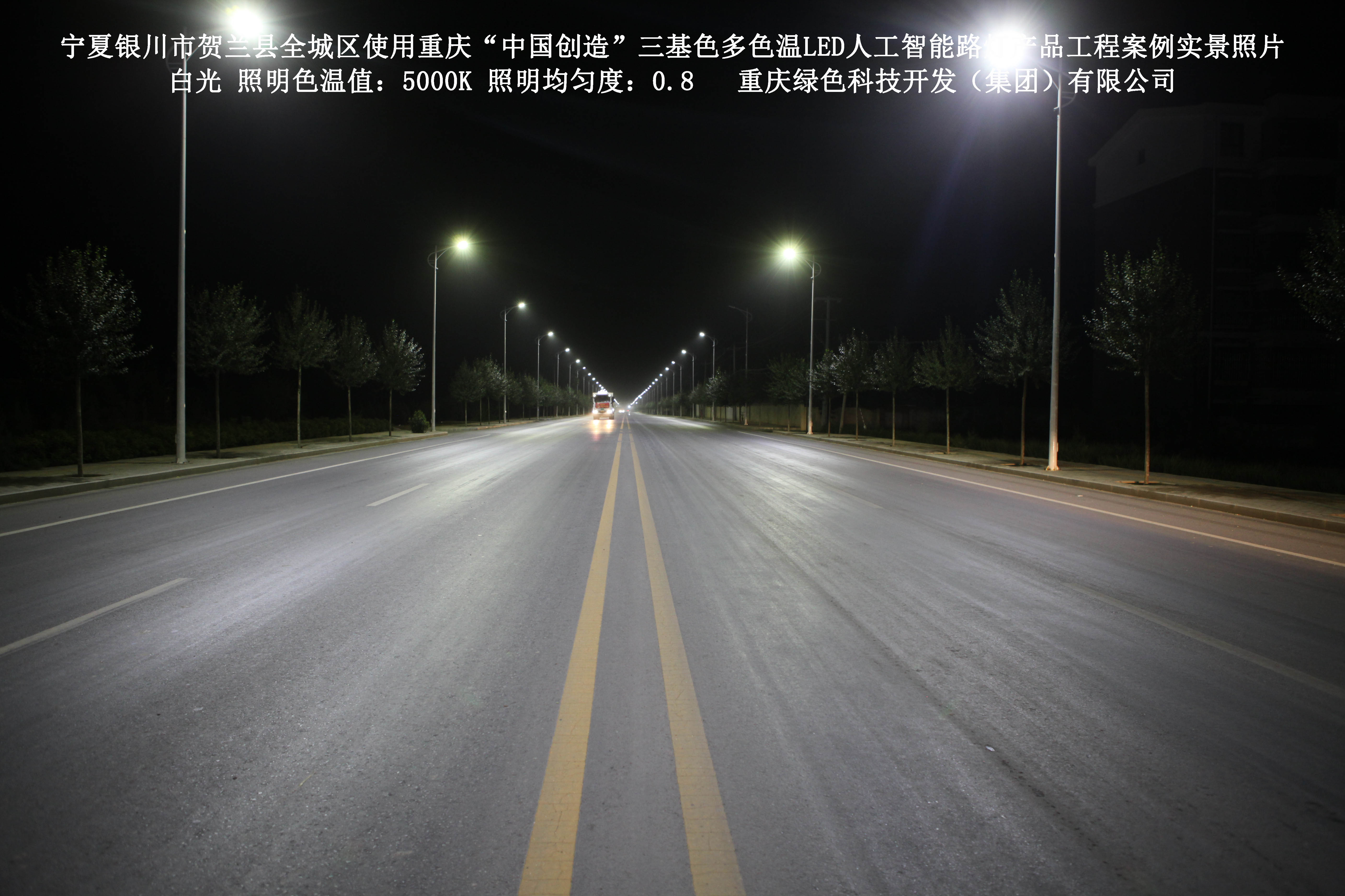 2017年12月,寧夏銀川市賀蘭縣城市管理綜合執法局,使用了我司研發制造的重慶“中國創造”三基色多色溫LED人工智能路燈6348盞,對全城區實施了綠色照明科技節能改造工程,該工程已全面竣工。工程實施后,極大地提高了賀蘭縣全城區城市照明清晰度、燈光均勻度、舒適度。通過智能終端實現單燈感知、線纜防盜報警,與原高壓鈉燈相比,節能率60%以上,有效解決了關閉控制回路或間隔關燈方式造成的照明暗區,確保行人和車輛通行的安全,實現城市路燈照明系統的智能化管理,推進了智慧城市建設。