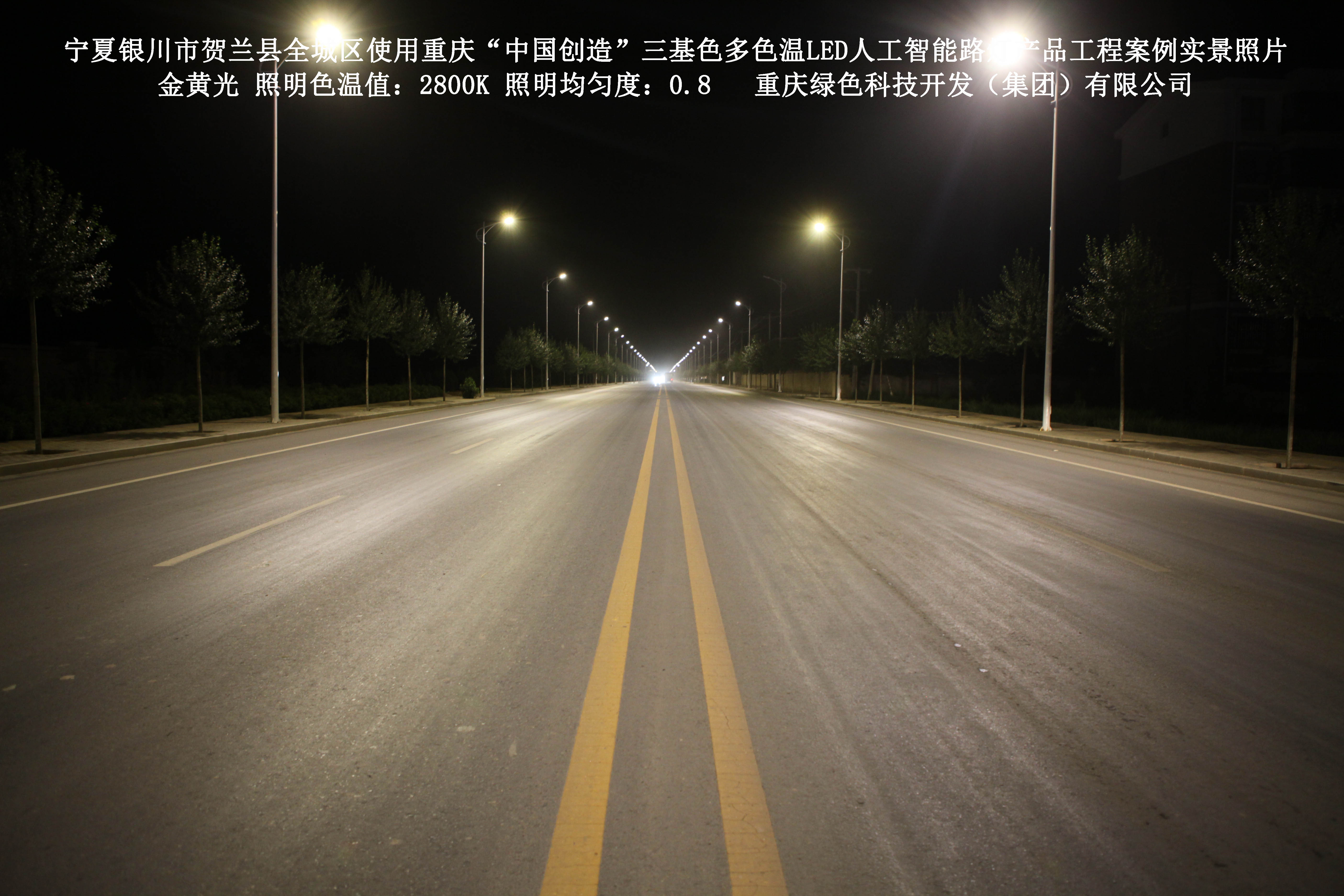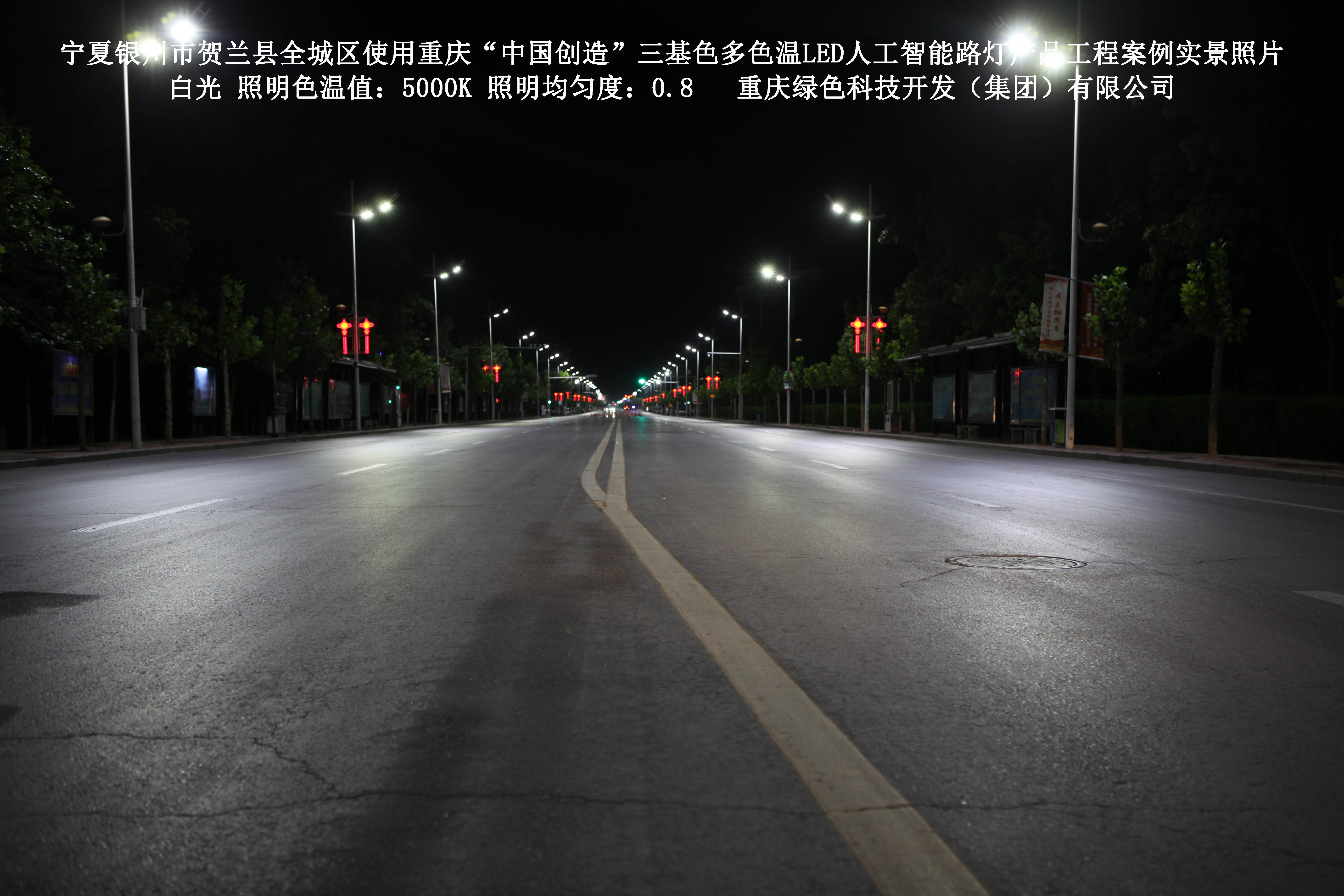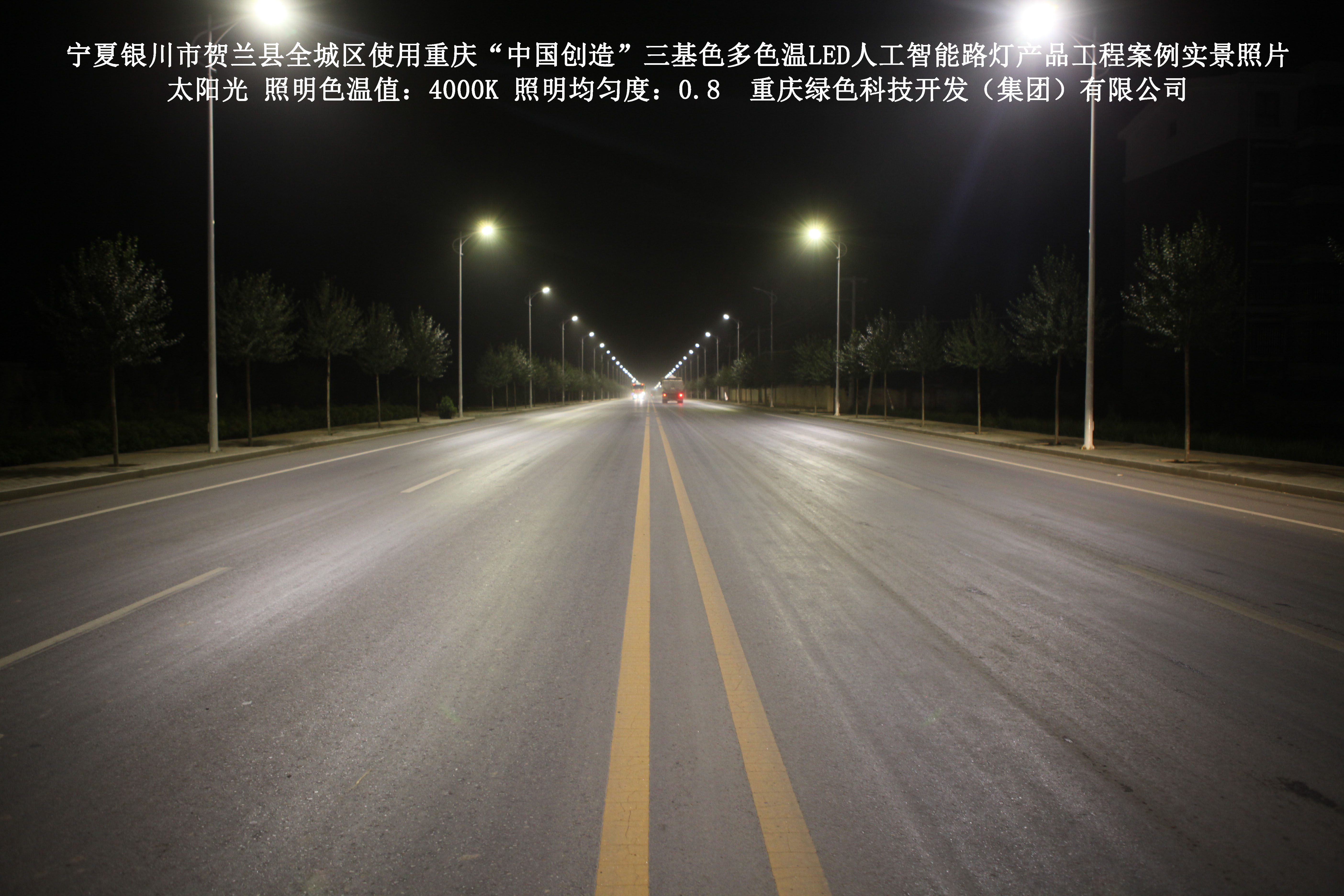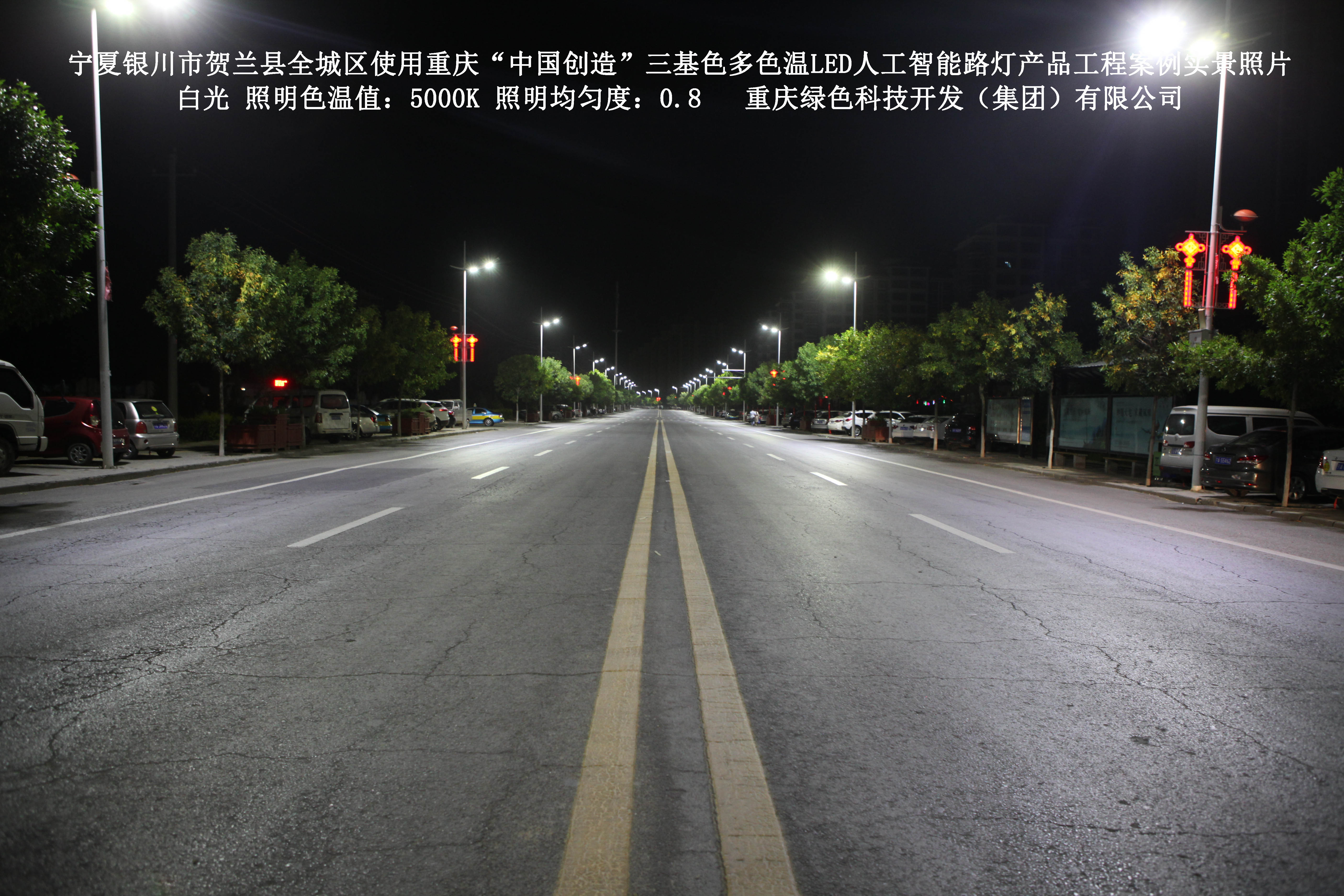2017年12月,寧夏銀川市賀蘭縣城市管理綜合執法局,使用了我司研發制造的重慶“中國創造”三基色多色溫LED人工智能路燈6348盞,對全城區實施了綠色照明科技節能改造工程,該工程已全面竣工。工程實施后,極大地提高了賀蘭縣全城區城市照明清晰度、燈光均勻度、舒適度。通過智能終端實現單燈感知、線纜防盜報警,與原高壓鈉燈相比,節能率60%以上,有效解決了關閉控制回路或間隔關燈方式造成的照明暗區,確保行人和車輛通行的安全,實現城市路燈照明系統的智能化管理,推進了智慧城市建設。