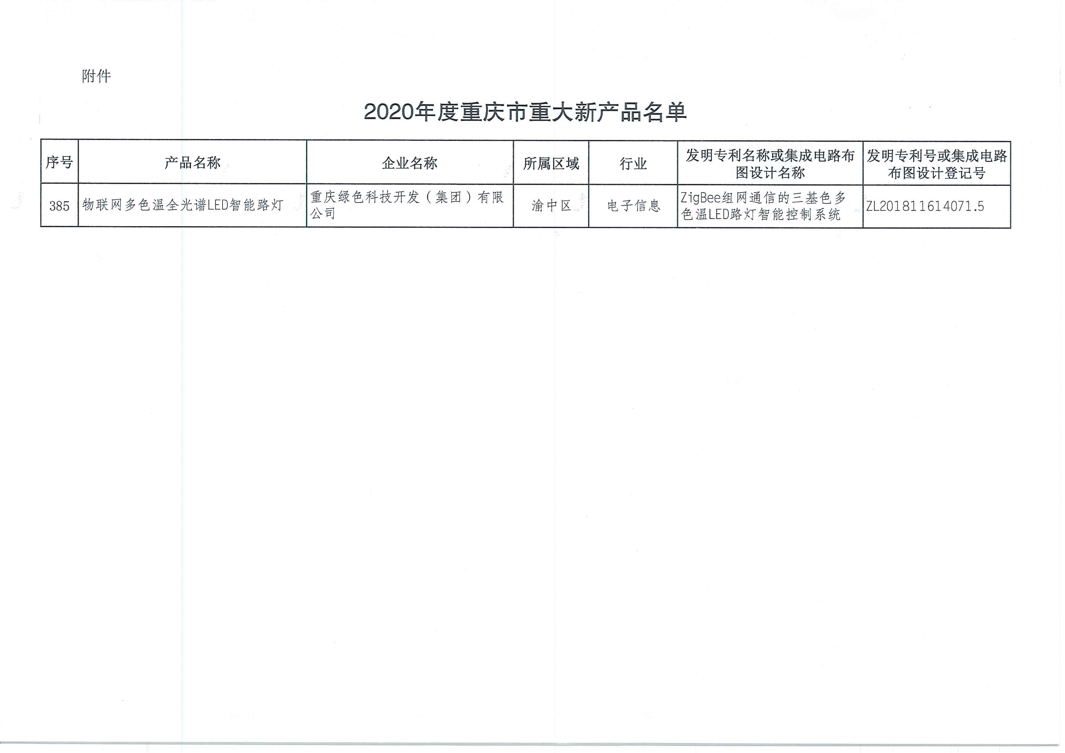 物聯網多色溫全光譜LED智能路燈產品榮獲《2020年度重慶市重大新產品》